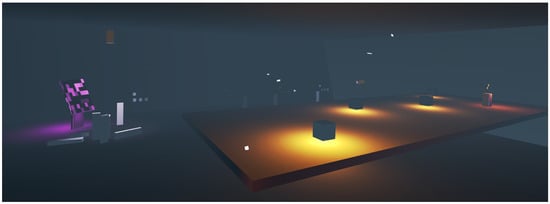 Table 1 summarizes the similarities and differences between the cited and our work. Although our work is most similar in the construction of acoustic environments to the methodology used in Half-Life: Alyx, The Mage’s Tale, and Vacation Simulator [43], it differs in the combination of the exclusive use of 3D binaural audio in 6-DoF, multi-source diegetic music, and rule-based systems that generate (sound-file-based) audio and map its behavior to several modes simultaneously. Furthermore, our work targets the Meta Quest 2 as the presentation medium and implements velocity-sensitive audio objects in select cases. Refs. [25,34,35] do not specifically mention the music’s spatial format or reference any point/surrounding ambiances.