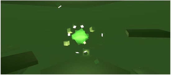 Screenshot of one of Planet Xerilia’s areas. The matte green small cubes that hover around a glowing, bright green center implement the motion-pattern-based system. These cubes constantly emit sound, with their motion and sound affected by the physics system.