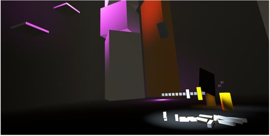 The authors compare two spatial implementations of an environment’s object-based music to demonstrate the differences in spatial response. The music contains three elements: two drone-based sounds are accompanied by bass-drum-like collision sounds. In one version, the 3D binaural audio spatializer embeds the drone-like sounds in the same space as the visual objects, with the music becoming diegetic. In the second version, randomized, stereophonic amplitude-based panning locates these sounds outside the game world, with the music becoming non-diegetic. In both cases, the sound of the collisions between the visual representations of the objects is kept in 3D binaural audio. The spatialization strategy implemented in the non-diegetic version shares similarity with the approach taken by [40] (see Section 2.4).