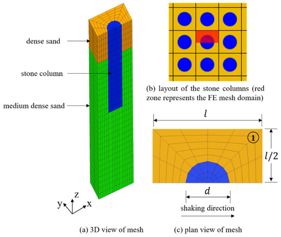 The 3D dynamic analysis was carried out using OpenSees. The stone columns are arranged in a square array, which is highly periodic and symmetric in structure, so the numerical analysis can be conducted with the model of one-half unit cell [15,16,17,18], as illustrated in Figure 1. The model is overall 30 m high. The top layer of 5 m thickness is the dense saturated sand with 80% relative density, and the underlain layer of 25 m is medium dense saturated sand with 50% relative density. This layout is aimed to simulate the in situ soil profile with the dense reclamation layer on top of the natural liquefiable sand. The groundwater table is set at the surface level. The permeability of all sand materials is 6.4 × 10−2 cm/s. The length of the columns is 15 m, and the replacement ratio is defined as the ratio of the cross-sectional area of the column to the unit cell. The center-to-center distance of columns for each scheme is calculated according to the replacement ratio and the column diameter. Other parameters of sand and stone materials are documented in Table 1 and Table 3. The site is modeled using brickUP elements [34], following the - dynamic consolidation equation, while the thickness of elements is 1 m.