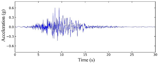 Considering the periodicity of the model [36], the boundary conditions are set as follows: (1) the displacement of nodes in left and right boundaries sharing the same elevation are forced to be equal in -direction and -direction; (2) the displacement of nodes on the lateral boundaries are fixed in -direction; (3) the pore pressure on the soil surface is fixed to be zero; and (4) the nodes at the base are fixed, and the input seismic loading is imposed on the base along the -direction. The earthquake history recorded by the near-site seismic station is selected as the input seismic loading, and the peak ground acceleration (PGA) is adjusted to 0.6 g in order to meet the requirements corresponding to the seismic fortification intensive. The acceleration time history curve is shown in Figure 2.