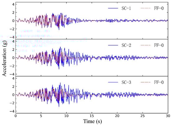 The earthquake responses of different schemes of stone columns are analyzed. The ground acceleration of point 1, indicated in Figure 1c, and the EXPP at different depths at the counterpart place are observed, based on which the liquefaction mitigation effects of each scheme are evaluated. Taking the free field model FF-0 and the stone columns foundation model SC-1 to SC-3 for examples, the time histories of ground acceleration and EXPPR are displayed in Figure 3 and Figure 4.