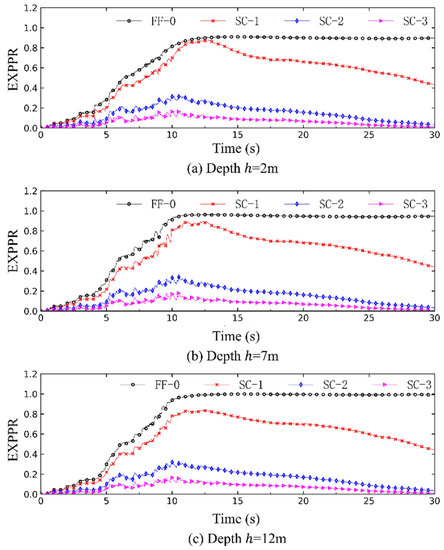 For the free field model (FF-0), upon seismic loading, the EXPPR at depths of 2 m, 7 m, and 12 m climb up immediately and the peak values were reached in around 10 s, after which the pore water pressure was difficult to dissipate. The peak value of the EXPPR at each depth is approximate to 1.0, indicating that the sand has nearly fully liquefied. However, the peak value of the EXPPR at the depth of 2 m is slightly lower than that of deeper layers, which can be explained by the dense sand layer‘s stronger liquefaction resistance.