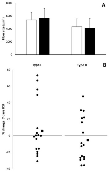 Graph of muscle fiber size at baseline and after 7 days of ICU admission. Type I and type II muscle fiber size in µm2 (n = 17) assessed at day 0 (T0, white bars) and day 7 (T1, black bars). Results are displayed as mean ± SD (A). Small black dots represent individual percentage change in type I and type II muscle fiber size over a 7-day period (B). Black squares represent the average percentage change in type I and type II muscle fiber size over a 7-day period (B).