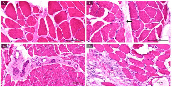 Representative images of muscle biopsy samples analyzed by light microscopy. Skeletal muscle biopsies showing (A) fiber atrophy and interstitial fibrosis. (B) Focal necrotic fibers being phagocyted by macrophages (black arrow). (C) Perivascular fibrosis without thrombi or inflammatory infiltrates. (D) Early stage of intramuscular fibrosis.