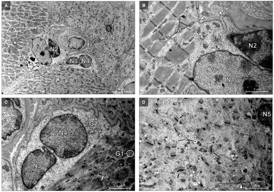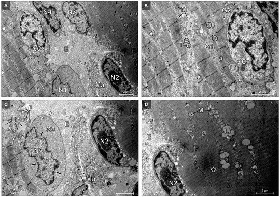 Electron micrograph of three myofibers, showing different degrees of degenerative changes. (A) Myofibers show different degrees of degenerative changes, from mild degeneration (white *), to moderate degeneration (black #), and towards necrosis (white #). Two myofibers have fragmented nuclei (N1 and N2; N3 and N4) located in a large membrane bleb that is oriented towards a neighboring capillary (C). The pyknotic nucleus (N5) of the third myofiber is centrally located. (B) Higher magnification of the mild degenerative myofiber, showing widened intermyofibrillar spaces with accumulated glycogen (G1) and swollen mitochondria (M). Lipid droplets (Li). Vacuoles (V). Subsarcolemmal accumulations of glycogen (G2). (C) Higher magnification of the moderate degenerative myofiber, showing myofibrillar disorganization and widened intermyofibrillar spaces with accumulated glycogen (G1). “Zig-zag” appearance of the Z-line (white arrow). Subsarcolemmal accumulations of glycogen (G2). (D) Higher magnification of the necrotic myofiber, showing extensive myosin loss with preserved but misoriented Z-line material and related actin filaments (black arrow), focal defects (white arrowhead) of the sarcolemma, and vacuoles (V).