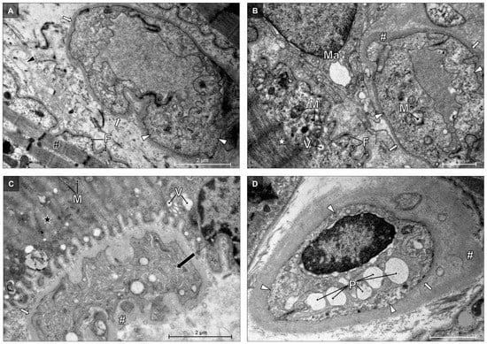 Electron micrographs of abnormalities of the endomysial capillaries. Abnormal capillaries are characterized by swollen endothelial cells, showing swollen mitochondria (M), numerous pinocytotic vesicles (white arrowhead), and thickened lamina (white arrow), sometimes accompanied by perivascular fibrosis (white #). (A) The adjacent degenerative myofiber shows narrowed myofibrils (black # ) with a preserved sarcomere structure, sarcolemmal folds (F), and additional layers of basal lamina (black arrowhead). (B) An active macrophage (Ma) is located between the capillary and the degenerative myofiber, showing myosin loss (white *), sarcolemmal folds (F), vacuoles (V), and swollen mitochondria (M). (C) This capillary shows proliferation (black arrow) of the endothelial cells, causing obliteration of the capillary lumen. The neighboring necrotic myofiber shows vacuoles (V), swollen mitochondria (M), and extensive myofilament loss (black *). (D) The lumen of this capillary contains degranulated platelets (P).