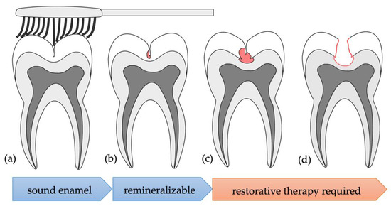 (a) The fissure is a predilection site for occlusal caries as its narrow anatomy hampers mechanical plaque removal. (b) Carious lesions often originate from the bottom of the fissure and are characterized by demineralized enamel. If detected at this stage, non-invasive remineralization therapy can be performed. (c) Going unnoticed, the lesion progresses, infecting dentin and (d) eventually causing cavitation. Here, remineralization is no longer sufficient; restorative therapy is needed.