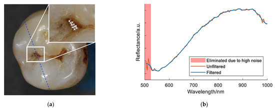 Classification and statistical analysis: Using custom MATLAB® (MathWorks, Natick, MA, USA) code, a graphical user interface (GUI) for reading, visualizing and selecting hyperspectral data was developed. Within this GUI, ten data points in close proximity to the histologically validated region were selected manually for each tooth (Figure 2a). The corresponding reflectance spectra were saved for further processing and associated with the histological occlusal state by binarization (0 = stained, 1 = stained lesion). The number of teeth and spectra within each occlusal health state group is shown in Table 1. In order to remove potential noise from the spectra, an additional second dataset was generated by applying a Savitzky–Golay filter (order = 2, frame length = 7) to the selected raw reflectance spectra (Figure 2b). The Savitzky–Golay filter is well established in (hyper)spectral data analysis because it enables an increase in data precision without distorting the underlying signal [30]. Intensities at the wavelengths 505–525 nm were eliminated due to the high noise level of the camera sensor in this region.