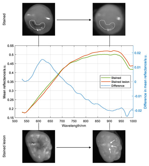 The spectral characteristics of the stained and stained lesion groups are contrasted in the mean reflectance spectrum (Figure 3). The difference spectrum (difference = reflectancestained − reflectancestained lesion) illustrates more clearly that the mean reflectance of stained enamel is higher than that of stained lesions in the wavelength range 525–710 nm. In contrast, stained lesions showed a higher mean reflectance in the wavelength range 710–1000 nm. This relationship is also visible in the raw reflectance images, where stains appear transparent at near-infrared wavelengths (Figure 3, dotted white lines), but stained lesions show an increased reflectance compared to the surrounding sound enamel (Figure 3, white arrows).