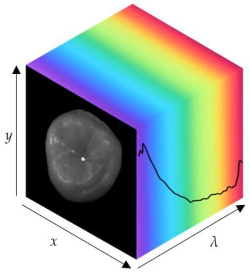 As light enters a material, it is repeatedly scattered, absorbed and reflected, and conclusions on a material’s composition can be drawn from its light-scattering and reflectance properties [15,16]. HSI detects the reflected light and has thus evolved to become a diagnostic technique in numerous medical fields, including cancer detection [17,18,19,20,21], heart disease [22] and retinal pathologies [23,24]. In dental caries detection, HSI relies on changes in enamel’s light reflectance due to biochemical and morphological alterations induced by a carious lesion [7]. HSI shows promising potential for early lesion detection in a clinical setting, with short image acquisition times and noncontact, nonionizing imaging [11,12]. Unlike previously applied spectral imaging approaches that focus on specific wavelengths, here, hyperspectral imaging considers a wide range of wavelengths and combines spatial (morphological) and spectral (chemical) information [13]. Different data processing techniques have been applied to hyperspectral data in dentistry, including the examination of characteristic wavelength intensities [12] and automated quadratic discriminant analysis [11].