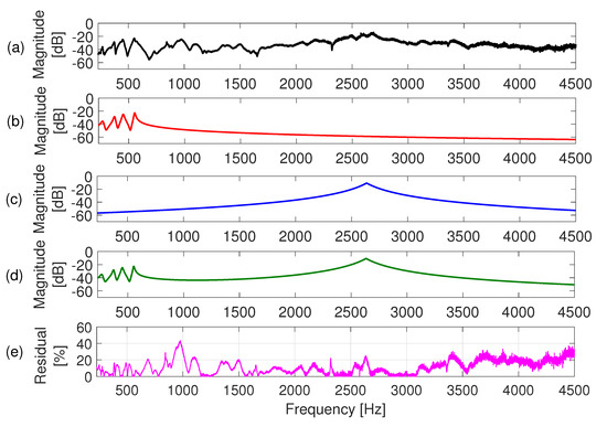 The second component in Equation (7) accounts for the reconstruction of the mid-frequency portion of the FRF (Figure 2c). The parameters controlling are the result of the fitting performed on the RP curve of H1.