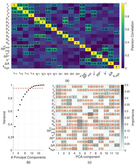 To understand if these “hand-crafted” features are linearly independent and statistically significant, we computed the Pearson correlation coefficient between the column vectors of the feature matrix extracted from the dataset. Subsequently, we performed principal component analysis on the same matrix.