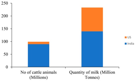 The United Nations adopted the Sustainable Development Goals (SDGs) in 2015 as a universal declaration to take action to combat poverty, protect the environment and ensure peace and prosperity for all by 2030 []. The 17 SDGs are interconnected to each other, where the actions in one area influence the outputs in another area and the development must stabilize the social, economic, and environmental sustainability. Dairy cattle are the most significant area that empowers to support and achieve the following SDGs such as No poverty (goal 1); Zero hunger (goal 2); Good health and well-being (goal 3) and Gender equality (goal 5) []. Milk and dairy products help to improve the health of the world’s population because they contain proteins, vitamins, and minerals that are beneficial to both children and adults’ growth and development []. According to the food and agriculture organization (FAO) estimates [], India will account for 54% of the increase in global demand for milk and fresh dairy products. To meet the rising demand, India’s dairy producers will need to produce an additional 56 million tons of milk per year by 2026, representing a 40% increase in output from 2014. However, the milk productivity of India is very low when compared to the United States (US) in the same year. Figure 1 clearly illustrate that India is a pinnacle with inside milk production, however, the productivity of India is very low as the US produce 93 million tons of milk with 9.2 million dairy animals, where India produces 140 million tons of milk with 90 million diary animals []. Concerning milk productivity, there is also the issue of high methane emissions from milk production due to poor feed quality, and the FAO concludes that the region is responsible for 23% of global methane emissions from dairy production [].