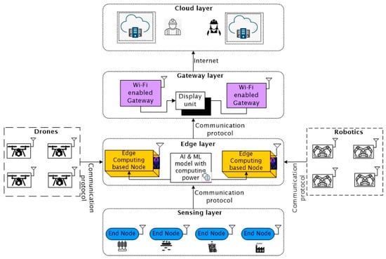 ML and DL models are currently being created and deployed using edge computing powered hardware to train on real-time data and make decisions at the edge device itself []. Drones are autonomous robots that fly in the sky and are associated with different applications such as disaster mitigation, communication, surveillance, transportation, safety and security, environmental protection, and intelligence gathering []. Drones can move autonomously toward IoT devices to collect data, establish a real-time connection, process the data, and send it to collect nodes or other devices []. Robots are used widely in hazardous environments, to perform the repetitive tasks of humans and these robots are made intelligent to do complex tasks by integrating with sensing, computation, and communication capability in it []. Indeed, IoT technology would greatly enhance these characteristics to meet the demands of sophisticated applications in pervasive and distributed contexts, particularly those with a high level of criticality [].