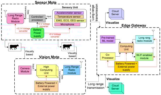 Figure 4 illustrates an architecture that is capable of monitoring the physical and mental health parameters of the dairy cattle with sensor mote and vision mote. The sensor mote attached to the body of the dairy cattle provides information related to body temperature, position (lying, standing), and heart rate. The sensor for muscle strength and behavior analysis can only be used during critical conditions and rare conditions. All the sensors are interfaced with the controller of the sensor mote. In this architecture, a long-range radio module is preferred as it is the communication protocol that is capable of transmitting to long-range up to 10 km with low power consumption. Every individual sensor mote of dairy cattle is identified with an ID provided in the controller through programming. Based upon ID, the edge gateway identifies the identity of the sensor mote and processes the data. An edge gateway is powered with edge computing and a pre-trained ML model, where it analyzes the received data and provides insights from it. In case, if it identifies that the particular dairy cattle are unwell, then it immediately transmits the information to the farmer/user on the cloud server. The vision mote is placed inside the cattle shelter, before the cattle and the visuals captured are transmitted to the edge gateway for analyzing the physical and mental behavior of the cattle. The computing of the data is processed at the edge gateway, and it sends the insights or data related to the condition of dairy cattle on a cloud server. To enhance the computing power of the edge gateway, it is powered with a co-processor and is charged with a dual power supply. Transfer learning and domain adaption approaches can be employed in collaboration with deep neural networks at the edge gateway to improve cross-domain image recognition generalisation [,]. Furthermore, transfer learning ensures that deep-learned features become more domain-invariant when carrying discriminative representations for cross-domain visual recognition. Edge gateway also enhances the latency and provides insights in real-time within a minimum duration.