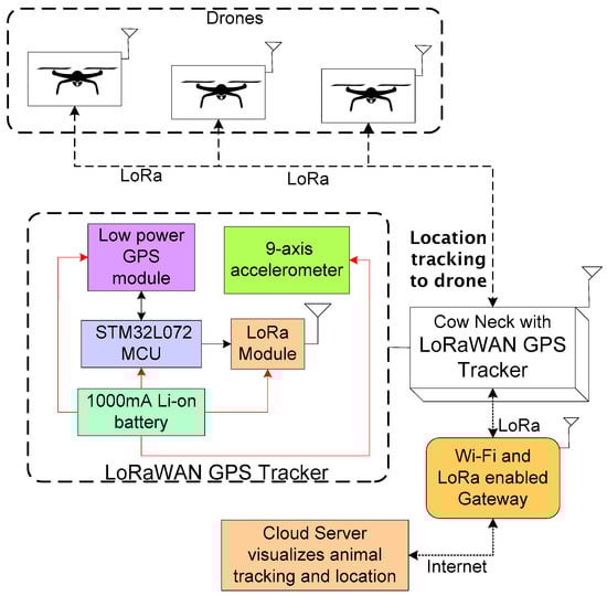 A LoRaWAN GPS tracker [] interfaced to the cow neck, is capable of providing the GPS location and motion of a cow. This tracker comprises of a low power GPS module and 9-axis accelerometer, and these two components are interfaced to the STM32L072 MCU along with LoRa module and 1000 ma Li-on battery. The ID provided in the GPS tracker assists the drone to categorize the identification of particular dairy cattle in the grazing field. The drone is equipped with a LoRa module that allows it to communicate with cattle for knowing the location and tracking during emergency state. In addition to this, the LoRaWAN GPS tracker communicates the location and motion information of dairy cattle to the farmer/user upon request from the cloud server through the gateway. The gateway is linked to LoRa and Wi-Fi in order to transmit and receive sensor data via LoRa and the internet. The cloud server provides feasibility to the farmer/user to visualize position and motion of each dairy cattle and it enables to realize the digitalization of the animal tracking. Moreover, the geo-fencing can be added to this system, as it also triggers the events if any dairy cattle move away from the fencing of the premises. Geo-fencing relies on GPS, Wi-Fi, RFID, and cellular data, and it is achievable with the existing system because GPS is available in the cow neck.