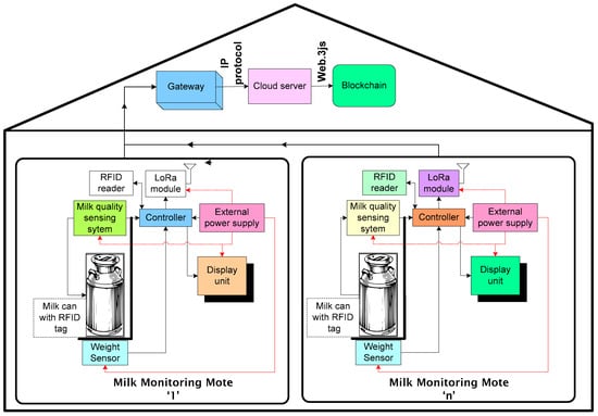 A sensing system is utilized for checking the milk quantity, and a weight sensor is used for the measurement of weight of the milk vessel. In addition to this, an RFID reader interfaced to the milk monitoring mote recognizes the identification of the milk vessel through the RFID tag attached to it. This framework assists to establish communication when ‘n’ number of milk monitoring mote are deployed in dairy farm in a scalable manner. To connect ‘n’ number of the milk monitoring mote to the blockchain, first it needs to connect to the cloud server. To connect to the cloud server, it should establish communication with a gateway, so the LoRa module embedded in the milk monitoring mote empowers it to connect to the gateway. The LoRa module in the gateway serves as a receiver unit, and the Wi-Fi module allows it to connect to the internet and log data to a cloud server. Here the cloud server is interfaced to the blockchain web3.js interface, and this interface is utilized to connect the cloud server and blockchain locally or remotely through HTTP, IPC or WebSocket. Blockchain enables the provision of real-time data of milk with transparency and security. Moreover, the trust and collaboration with different business entities will be enhanced further for digitalized real-time information.