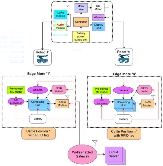 The architecture illustrated in Figure 8 empowers the implementation of the edge device with robots for planning a healthy diet and feeding the cattle with respect to the health conditions. The edge mote is placed in the position of the cow where the image captured by the camera module is analyzed by the pre-trained model embedded in it. Further, the results of analytics are communicated to the robots in the premise of dairy cattle through LoRa. Based up on received health information, the robots prepare the food to the dairy cattle. This food is placed in the chamber of mobile robot, that carry the food to the particular cattle position. Mobile robot identifies the ID of the particular cattle that is provided during firmware development in both mobile robot and edge mote. The implementation of robots also ensures the health environment to the cattle, as it is difficult for the cattle, if the farmer/user are unhealthy. The co-processor in the edge mote provides the computing power for analyzing the data with the ML model. Moreover, the information is logged on the digital platform i.e., cloud server through gateway. The integration of robots, ML, IoT and edge devices has facilitated the implementation of intelligent systems to ensure a healthy diet for dairy cows.