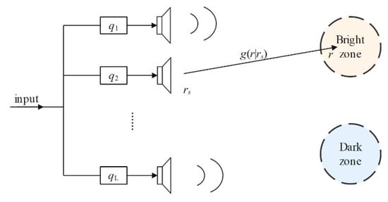 Personal audio systems aim to focus sound to a listening zone without disturbing others, which can be realized by multi-zone sound field reproduction technologies. Multi-zone sound field reproduction creates two different kinds of zones: the bright zone where a desired sound field is reproduced, and the dark zone where the sound pressure level needs to be attenuated. Figure 1 is the schematic diagram of the multi-zone sound reproduction. Assuming that there are M discrete control points in the target area, the sound pressure generated by the loudspeaker array composed of L units in the target area can be expressed as: