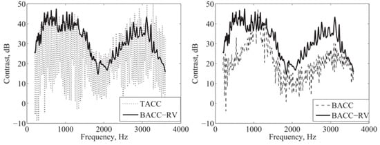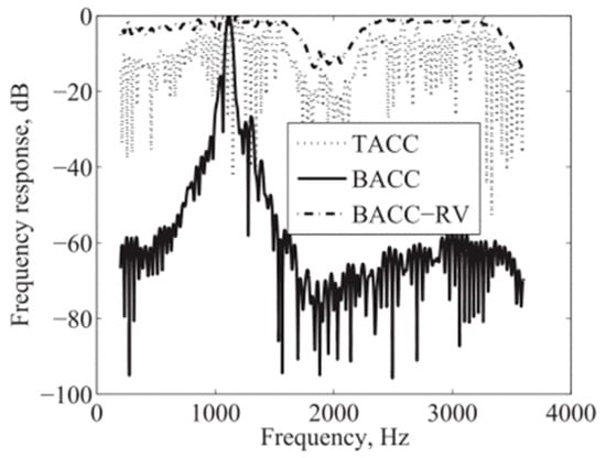Acoustic contrast versus frequency with traditional acoustic contrast control (TACC), broad acoustic contrast control (BACC), and BACC-response variation (RV) methods [45].