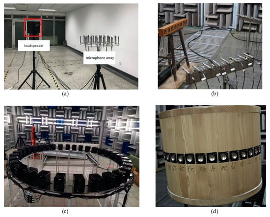 Figure 5 shows several typical microphone and loudspeaker arrays for personal audio systems. Figure 5a shows a microphone array for sound field recording, and Figure 5b–d show several different personal audio systems. In Figure 5b, a linear loudspeaker array is used to control the sound field. The bright and dark zones are generated at the two microphone arrays in this figure, respectively. Figure 5c shows a circular array, and the bright and dark zones are inside the circular area. Another circular array provided in Figure 5d is able to achieve sound field radiation in a certain direction.