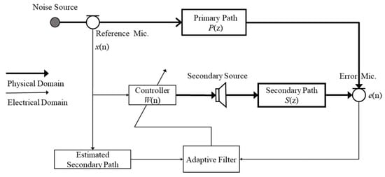 Alternatively, ANC systems can be divided into feedforward and feedback systems depending on the control structure [59,60,61,62]. Feedforward systems are a classic type of ANC systems, which obtain a reference noise signal through a reference sensor and then performs noise reduction at the error point. Feedforward systems have good stability and have thus been widely used. The block diagram of a single channel feedforward ANC system is shown in Figure 6. However, this system requires high coherence between the reference signal and the primary noise signal, which often requires experienced selection of the reference point. Feedback systems, on the other hand, require no reference microphone and are suitable for occasions where the reference signal is not easy to obtain. Therefore, feedback systems perform well in consumer electronics with low cost and complexity such as a noise-canceling headset. However, the feedback algorithm needs to make a trade-off among water bed effect, stability, and noise amplification. Moreover, hybrid feedforward and feedback systems can improve the noise reduction performance with the poor coherence between the feedforward reference signal and the noise signal.