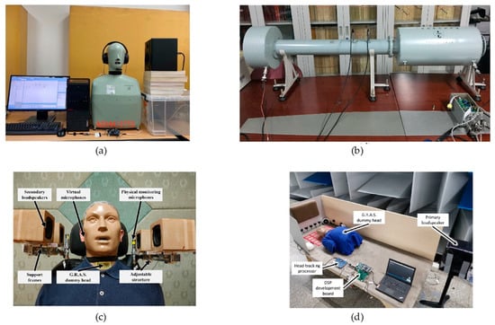 Pipe mufflers in Figure 7b are another one-dimensional noise reduction application which involves acoustic feedback and effects of airflow and temperature. Because the primary noise is usually periodic, non-acoustic reference signals such as revolving speed, acceleration signal, and generated tonal signal are widely used to remove the secondary path feedback effect. In the case of narrowband active noise control, frequency mismatch (FM) between estimated frequencies and true frequencies may decrease the noise reduction and even make the system unable to work properly in some extreme circumstances. Some improvements have been made in the narrow-band ANC system involving variable step-size algorithms [89] and frequency estimation algorithms [90]. In Figure 7b, a circular pipe system with an active-passive hybrid compound muffler was established. The primary source is set at the front-end of the pipe system while the secondary source at the after-end of the muffler. Signal processing is performed online by a controller with a development board Omap-L137 based on TMS320C6747. This system achieves good reduction performance of multiple tones with time-varying frequencies.