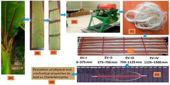 The Enset fiber was extracted from the pseudostem part of the Enset plant, made up of several layers of sheaths, as shown in Figure 1A. The Enset fiber was decorticated from the stem sheath, using decortication machine/manual decortication, as shown in Figure 1D, into technical long (bundles) fibers. The extracted fibers were around 1500 mm long. The Enset plant used was obtained from Welkitie, Ethiopia.