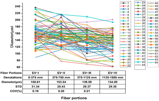 The distribution of physical properties of Enset fiber along fiber sections was investigated quantitatively. By analyzing the fiber sections throughout the length of the four segments, EV-I, EV-II, EV-III, and EV-IV, it was noted that the mass distribution was 5.9 ± 1.85, 5.5 ± 1.7, 5.1 ± 1.6, and 4.9 ± 1.6 mg for each section, respectively, as presented in Table 1. The results indicated that the mass distribution along the fiber sections from the bottom to the top decreased by 18.3%, and the minimum value was noted at the top section, as presented in Figure 2, using Origin Software. In addition, the linear density also followed a similar trend, as presented in Table 1, and it was reduced by 18.75%. It was observed that the tenacity of the fibers significantly improved for the fibers with a medium linear density. This is not in agreement with Mukhopadhyay et al.’s analysis, who reported that the tenacity of the fiber improved for the fibers with a low linear density [22]. The reduction in mass distribution and linear density along the fiber sections could be due to the variation in chemical composition, which occurs between the bundle fibers. Lefeuvre et al. arrived at similar conclusion [23]. Additionally, the bundle diameters and cross-sections of EV-I, EV-II, EV-III, and EV-IV were evaluated. The analysis indicates that the fiber diameters were 158 ± 31.3, 153 ± 28 µm, 140 ± 30 µm, and 134 ± 30 µm for the EV-I, EV-II, EV-III, and EV-IV samples, respectively, as demonstrated in Table 1 and Figure 3. This indicates that the diameter of Enset bundle fibers ranged from 134 to 158 µm; this value is in agreement with the investigation by Negawo [24], and the standard deviation was found to be 30, which is a similar result to that of Charlet et al. [25]. The evidence of the Enset fiber family of Musaceae showed that the shape of the Enset fiber is elliptical rather than circular [26].
