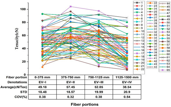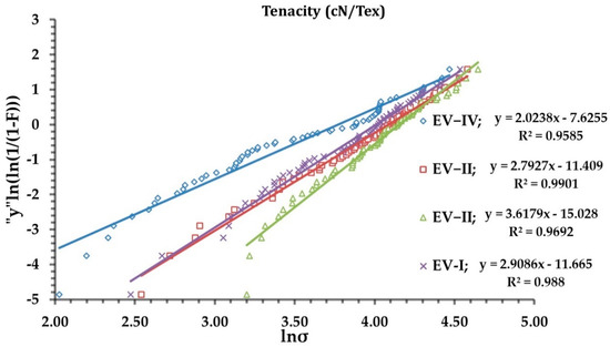 Similarly, the coefficient of variation is at its minimum at the fiber portion EV-II and maximum at the top portion of the fiber EV-IV. The Weibull distribution’s coefficient of variation is solely a function of the Weibull modulus, with the relation = 1/β, the measure of the strength distribution, fluctuating between 0.05 and 0.5. In Figure 10, it can be seen that the higher the Weibull modulus in the case of fiber portion EV-II, the more homogeneous the material is, and the stress to cause failure at a given probability value will be higher. Therefore, in terms of the fiber portions, the Weibull modulus can thus be used as an indirect parameter to verify if the location of the fiber along the length affects the tenacity of the Enset fiber.
