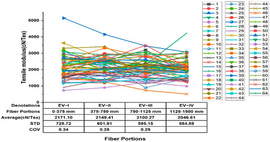 The faults generated during harvesting and subsequent decortication most likely resulted in a severe drop in strength at the top fiber section [5]. The tensile strength increased at the middle and again decreased toward the top of the pseudostem [23]. This may be due to the fact that, as the fiber diameter decreases, the microfiber angle and the cellulose content increase. This was not in agreement with the reported significant variation in mechanical properties with a change in fiber diameter [22]. Young’s modulus followed a similar trend to the tensile strength, as shown in Figure 5. As demonstrated, the tensile modulus decreased from the first portion, EV-I to EV-II, and decreased in the third portion, and a further decline was observed in the top section. This analysis is in agreement with the argument of Liu and co-workers [5].