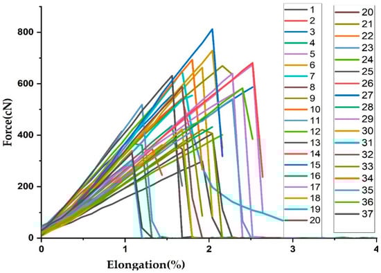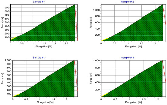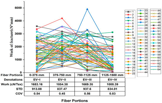 The work of rupture is a measurement of a fiber’s ability to absorb energy and its ability to endure a sudden shock. Strong fibers are inherently inextensible, and vice versa; therefore, a comparatively weak fiber may have a larger work of rupture than a very strong fiber. As shown in Table 2, the work of fracture in terms of work conducted for the fiber portions EV-I, EV-II, EV-III, and EV-IV were 1683.2 ± 913.07, 1854.4 ± 837, 1669.4 ± 937.60, and 1008.4 ± 834.01, and 1008.4 ± 834.089 cN*mm, respectively. The work of rupture increased by 10.17% around the second section (EV-II), slightly decreased by 9.9% (EV-III), and dramatically declined by 65.54% at the top portion (EV-IV), as shown in Figure 7. Remarkably, the work of rupture observations followed the same pattern as the tenacity results. The stress–strain curves are shown in Figure 8. The fibers deviate significantly from a linear relationship, but the concept of the work of rupture as one half the product of load and extension at break can be preserved by introducing a “work factor”, which is the ratio of the actual work of rupture to the product of load and extension at break. Concerning the work factor, the work of rupture was measured automatically from the Tenso lab machines as soon as the fiber failure occurred, and the work factor was calculated for each portion of the fiber samples. The work factor will be more than 0.5 if the load–elongation curve lies mainly above the straight line; if below, it will be less than 0.5. In this regard, Hearle and Morton reported that most bast fibers have a work factor of around 0.5 [33].