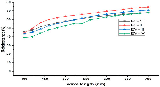 Based on photometer measurements, the color and lightness of the Enset fiber along the sections of the fiber were analyzed, as shown in Table 3 and Figure 9. The positive CIELab values b* and a* indicated a yellow/red coloration for all Enset fibers. This analysis indicates that the reflectance value and the L* value were higher in the case of fiber portions at EV-II, and in this section, the fiber quality was significantly higher (higher L*), and for excellent and good fiber qualities, less red (lower a*) should occur. The previous investigation indicates that for superior grades, the color value will support the fiber grading system. The color value, according to Richter et al., will enhance the fiber grading system, which has been demonstrated at a higher L* value, showing high-quality fibers [18].