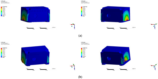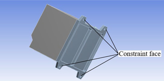 In the actual working process of the electric control box, the bottom of the box is in a constraint state. Therefore, four fixed holes at the bottom of the box were constrained in the mode analysis, as shown in Figure 6.