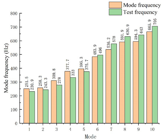 Using the finite element calculation results, the acceleration sensors were affixed to the maximum displacement positions of each mode, and the first 10 order natural frequencies were measured and compared with the finite element results. The comparison results are shown in Figure 9.