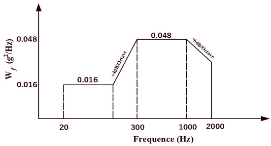 The boundary conditions were not changed during the calculation. The applied random load spectrum is shown in Figure 10; the abscissa f represents the frequency (Hz), and the ordinate Wf represents the acceleration PSD (g2/Hz). The loading was performed in the X, Y, and Z directions. The calculated total acceleration root mean square () was 8.42 g.