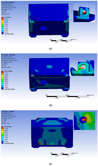 Figure 11 shows the equivalent stress change of the electrical control box at the dangerous point in the X, Y, and Z directions; in the figure, the abscissa is the frequency, and the ordinate is the stress. The second-order mode in the X direction, the fourth-order mode in the Y direction, and the third-order mode in the Z direction exhibited the maximum stress, and the corresponding mode frequencies were = 258.3 Hz, = 377.7 Hz, and = 309.8 Hz, respectively.