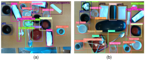 The object detection model needs to be trained in advance on a dataset. The main purpose of this research is to detect different kinds of dishes. There are 16 kinds of dishes, including Fish-dish, Towel-dish, Rice-bowl, Chopsticks-two, Towel, Cup, Spoon, Soup-bowl, Water-cup, Tea-cup, Waster-paper, Square-bowl, Chopsticks-one, Paper, Chopsticks-cover, Wine-cup. As Figure 3 shows, the two images contain all 16 kinds of dishes.