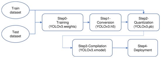 The Vitis AI [43] is a convenient and efficient tool which can deploy and accelerate AI inference on Xilinx hardware platforms, including edge devices and Alevo accelerator cards. In this research, we deploy the pruned YOLOv3 model on the ZCU102 evaluation board using the Vitis AI. Specifically, as shown in Figure 4, the whole process can be approximately divided into the following steps: