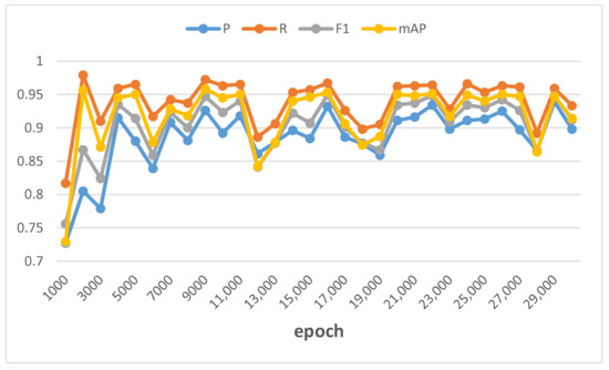 In this research, we first use the dish dataset to train the YOLOv3 model under darknet. During the training process, we save the model every 1000 epochs, and we also save the model with the largest mean average precision (mAP) for subsequent research. Figure 6 shows the results of the trained model from 1000 epochs to 30,000 epochs. Generally speaking, in object detection, mAP is a comprehensive indicator for evaluating the detection ability of a model. Therefore, in this research, we call the model with the largest mAP in a certain training process as the best model of the training process.