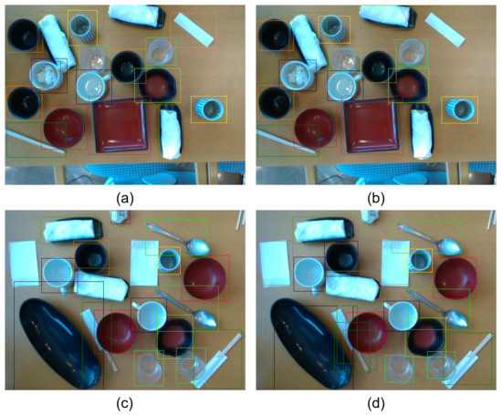 The key for the proposal is the detection of the dishes. In fact, there are many different types of dishes for each scenario as shown in Figure 1, including bowls, plates, cups of different colors and sizes, and even chopsticks and spoons. It is hard work to correctly detect and identify these different types of dishes for recycling. At the same time, in order to apply the empty-dish recycling robot in real life, the time for detection should not be too long, otherwise it would seriously affect the subsequent recycling work. Therefore, our aim is to increase the speed of the detection process as much as possible while ensuring the accuracy of the detection.