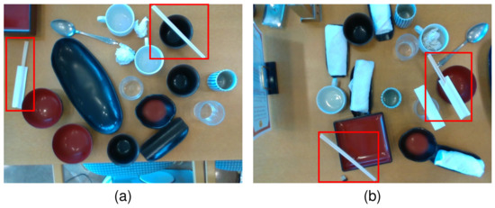 The reason for the low detection accuracy of several kinds of dishes related to chopsticks is not only due to the insufficient learning caused by the small quantity, but also the characteristics of these kinds of dishes themselves. For example, Chopsticks-two and Chopsticks-one are both chopsticks, and they are quite similar in appearance, which makes it more difficult for the model to distinguish them during the test process. In addition, as shown in Figure 8, in both images of the training dataset, the items marked by red boxes are all labeled as Chopsticks-two, but they actually have some obvious differences, partly just chopsticks and partly a combination of chopsticks and cover. In addition, in Figure 3b, Towel-dish is placed below the Towel in the upper right corner, but Towel-dish is not marked during the labeling process, which also affects the learning effect of the model to a certain extent. These labeling problems, which affect the accuracy of the pruned model, will be improved in the future work.