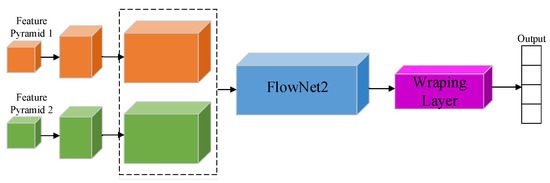 The optical flow network can forecast the movement trend of the target more precisely. This paper performs end-to-end offline pre-training on the optical flow network. The network structure is displayed in Figure 2. First, based on a coarse-to-fine scheme, this paper uses pyramid features instead of ordinary images as input. Then, FlowNet2 [27] is fine-tuned, using FlowNetC as the first block followed by two FlowNetS blocks to crop the optical flow map in accordance with the target location, and finally, for the purpose of reduce the number of parameters, the image features are distorted to output 4 different scales, 64 × 64 × 2, 32 × 32 × 2, 16 × 16 × 2, 8 × 8 × 2. Based on our findings, we found that end-to-end trained networks perform outstanding than untrained networks.