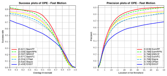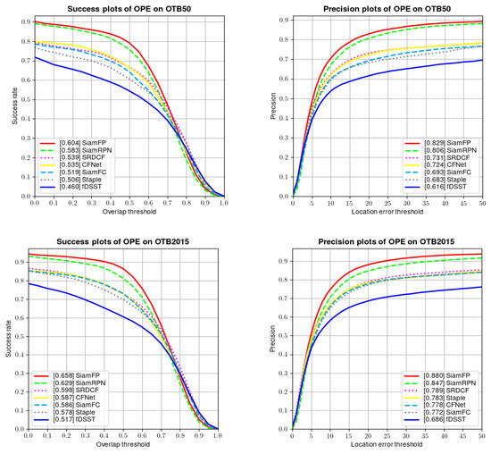 OTB benchmarks include OTB50 [36] and OTB2015 [37]. OTB2015 dataset contains 100 manually labeled video sequences, so the OTB2015 dataset is also called OTB100. OTB50 selects 50 difficult video sequences from OTB2015. Common evaluation metrics in the OTB benchmarks are accuracy and success rate. Accuracy refers to calculating the Center Location Error (CLE) between the model’s forecast location (bounding box) and the ground-truth of the target given a threshold T. The success rate refers to the IoU between the predicted position frame of the model and the target real position frame given a threshold T. On the basis of the accuracy and success rate indicators, OTB proposed the One Pass Evaluation (OPE) robustness evaluation indicator, which refers to initializing the first frame with the position of the target in the ground-truth, and then running the tracking algorithm for the purpose of gaining the average precision and success rate, generate OPE metrics.