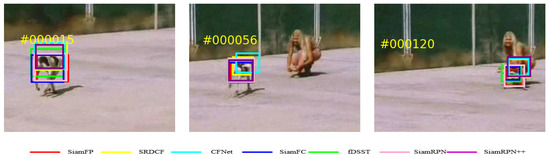 The comparative experiments between the SiamFP tracker and the more advanced trackers SRDCF [38], Staple [39], CFNet, SiamFC, fDSST [40], and SiamRPN have achieved leading levels in both OTB50 and OTB2015 benchmarks, and the OPE accuracy graph and the success rate graph is displayed in Figure 4. The experimental outcomes show that in the OTB50 and OTB2015 benchmarks, the tracking accuracy reaches 0.829 and 0.88, and the success rate reaches 0.604 and 0.658, respectively. Compared with the SiamFC algorithm, the precision is increased by 13.6% and 10.8% correspondingly, and the success rate is increased by 8.5% and 7.2% correspondingly. In the OTB2015 benchmark, the performance is significantly improved, especially in three complex scenes, occlusion (OCC), illumination variation (IV), and fast motion (FM). As shown in Figure 5. More results are summarized in Table 2. For the purpose of determining the effective improvement of the algorithm in this study in actual video sequences, video sequences with relatively complex scenes were selected from the OTB dataset as the visualization results, as shown in Figure 6. To sum up, the SiamFP algorithm adding optical flow network and attention mechanism has a good ability to suppress background interference.