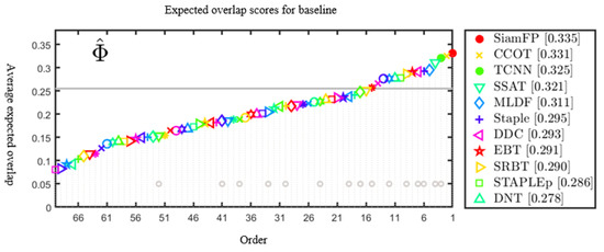 The EAO curve results of the VOT2016 assessment are shown in Figure 7 and Table 3. As is revealed by the results in the figure, SiamFP ranks first among 70 trackers according to the criteria for ranking trackers by EAO score, exceeding the performance of these state-of-the-art trackers. Notably, SiamFP outperforms the second-ranked tracker SiamFC by about 15%.