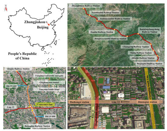 The existing Qinghuayuan Tunnel is a component of the Jing-Zhang High-Speed Railway. It is located in the heavily populated Haidian neighborhood of Beijing. It begins on Xueyuan South Road and terminates at Tsinghua University’s East Gate (Figure 1). The maximum inclination of the Qinghuayuan Tunnel is roughly 3%, and the minimum profile curvature radius is 995 m. The tunnel arch’s maximum depth of embedment is approximately 29 m. The middle portion of the Qinghuayuan Tunnel, with a length of 4.45 km, was excavated by a slurry pressure balance tunnel boring machine. The existing Qinghuayuan Tunnel is a circle-shaped tunnel. The inner and outer diameters of the tunnel linings are 11.1 m and 12.2 m, respectively. Each segment has a thickness of 0.55 m and a length of 2 m. The plan of the existing Qinghuayuan Tunnel and Beijing Subway Line 12 is shown in Figure 1. Figure 2 depicts the concerned zone of research.