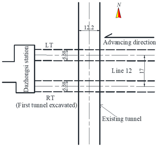 Figure 2 depicts the newly constructed east-west horseshoe twin tunnels part of Beijing Subway Line 12. The distance between them is around 18 m. The new twin tunnels are horizontally parallel. They were dug using the shallow tunneling method. The method based on the manual excavation is specifically suited for developing shallow tunnels. The twin tunnels’ excavation width and height are 6.68 m and 6.82 m, respectively. The primary and secondary linings have thicknesses of 350 mm and 300 mm, respectively (Figure 3).