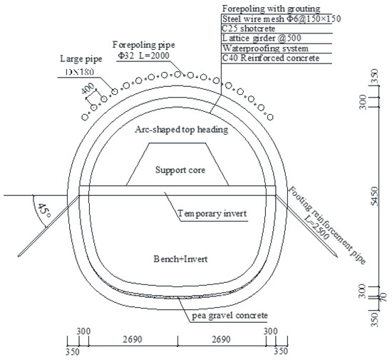 Figure 6 depicts a total of 16 grouting holes, each around 35 m long. A sleeve pipe is used to finish the grouting using a blend of conventional Portland cement and sodium silicate slurry. The grout hole had a diameter of 25 mm, and the diffusion radius was supposed to be 0.6 m. The grouting pressure was kept to less than 0.8 MPa. The water-glass slurry has a quick condensation time and an excellent pre-reinforcement effect, whereas the cement slurry takes a lengthy time to set but has a high strength later on. The cement slurry has a long setting time but high strength in the later stages, resulting in a good long-term reinforcement effect. The longitudinal section of the deep hole grouting is lapped by 2 m, and a stop wall is set before the next section of grouting. A 0.3-m thick C25 shotcrete stop wall is set at the tunnel’s surface outside the core soil of the upper step before each section of deep hole grouting, and the core soil is protected by 0.05-m thick C25 shotcrete. The angle of insertion of the grouting holes is controlled within the range of 4–10°. To reduce the settlement of the pipe shed during construction, a self-propelled pipe shed was used with side-welded latches to link the steel pipes together and form an integral support. The tube sheds were made of DN180 hollow steel tubes with a thickness of 12 mm, an insertion angle of 1–3°, and a circular spacing of 300 mm.